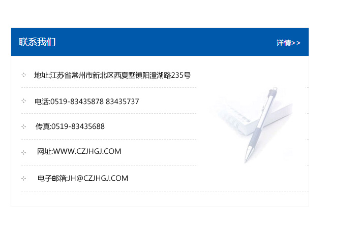 地址:常州市新北區友邦商務大廈1幢16、17層  電話:0519-85101652  傳真:0519-85112595  郵編:213022  網址:www_cz-jiayue_cn.zhchangyu.com  郵箱:xiajifengaa@163.com